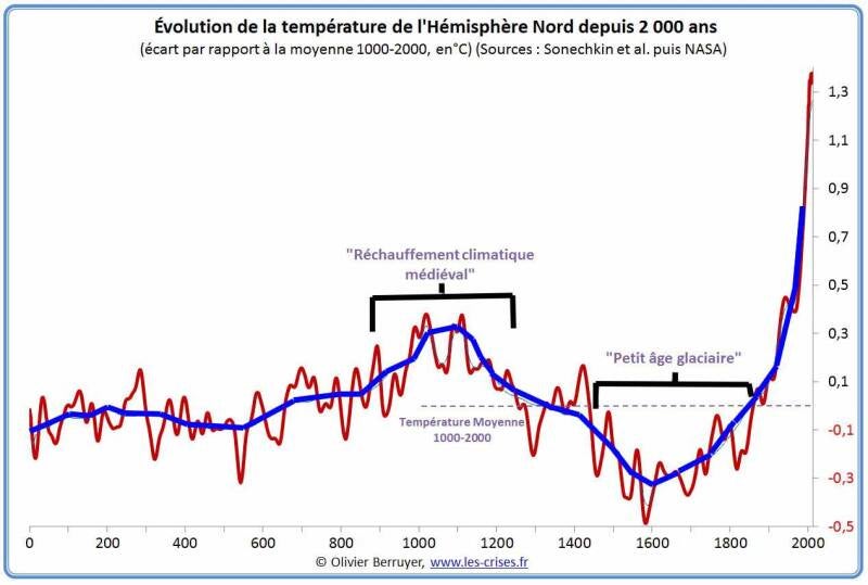 Cette seconde courbe est une courbe tendancielle calculée avec d’autres traitements statistiques. La courbe rouge serait équivalente à la courbe noire du premier graphique, alors que la courbe bleu est établie à partir des moyennes mobiles des températures annuelles sur 20 ans. Les variations annuelles sont lissées. On ne visualise plus que les tendances avec des amplitudes réduites. L’Optimum Climatique Médiéval et le Petit Âge Glaciaire sont clairement visibles avec une amplitude comprise entre -0,4°C et +0,4°C, mais les variations antérieures sont estompées. Pour ce qui est du pic contemporain, il faudra attendre quelques décennies pour percevoir la véritable tendance climatique. On ne peut en juger sur les variations annuelles des 5, ou même des 10 dernières années.