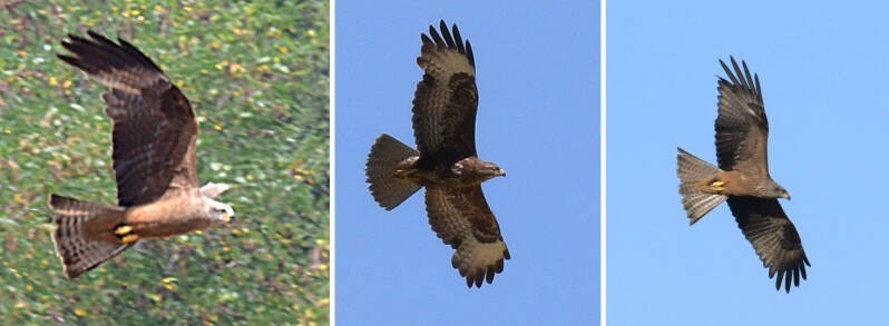Le Milan royal est reconnaissable à ses plumes blanches sur la face inférieure, et à une queue très évasée. Sur l'image de droite deux parents apprenaient à un jeune à voler face au vent.